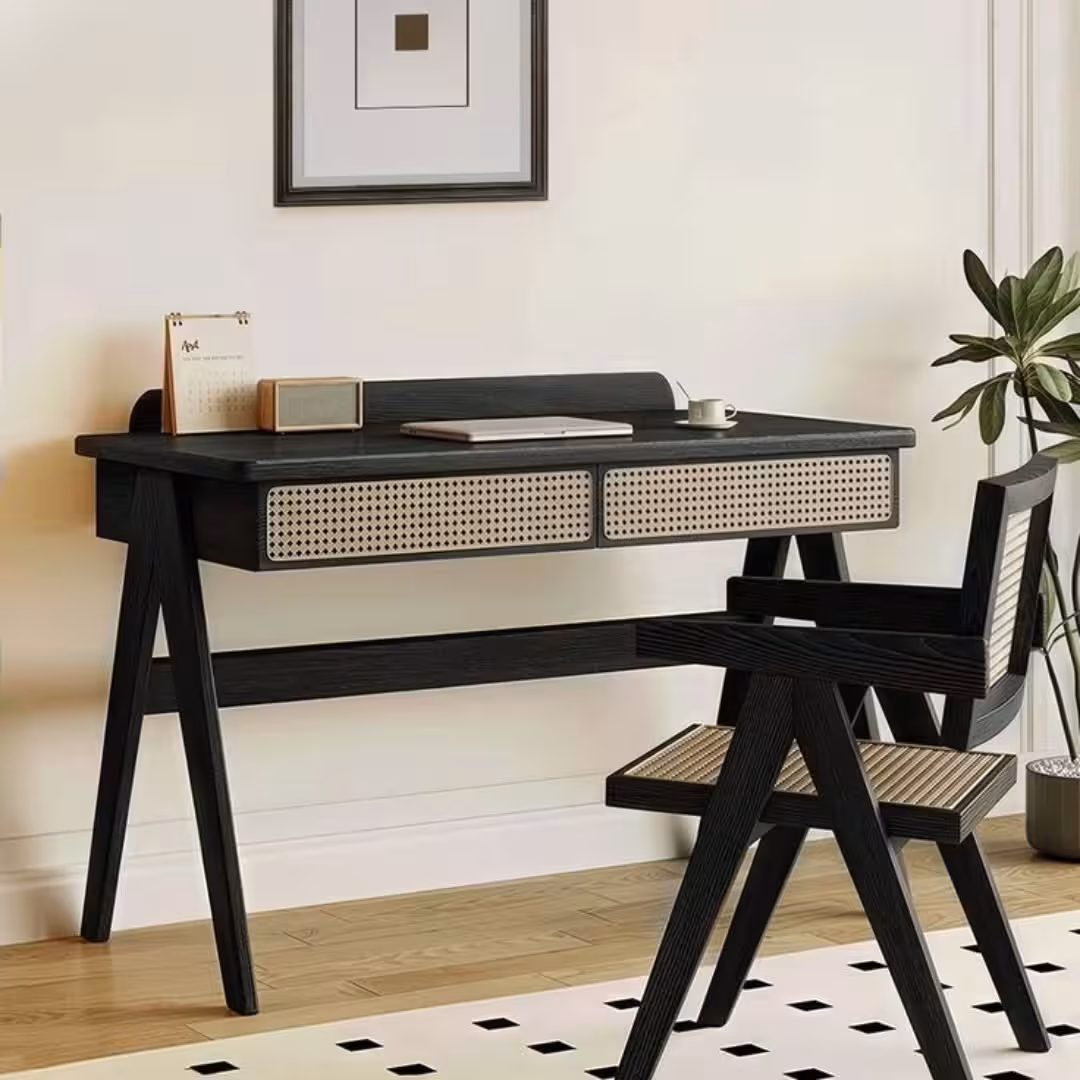 Modern timber desk and matching ergonomic chair featuring a smooth natural wood grain finish.